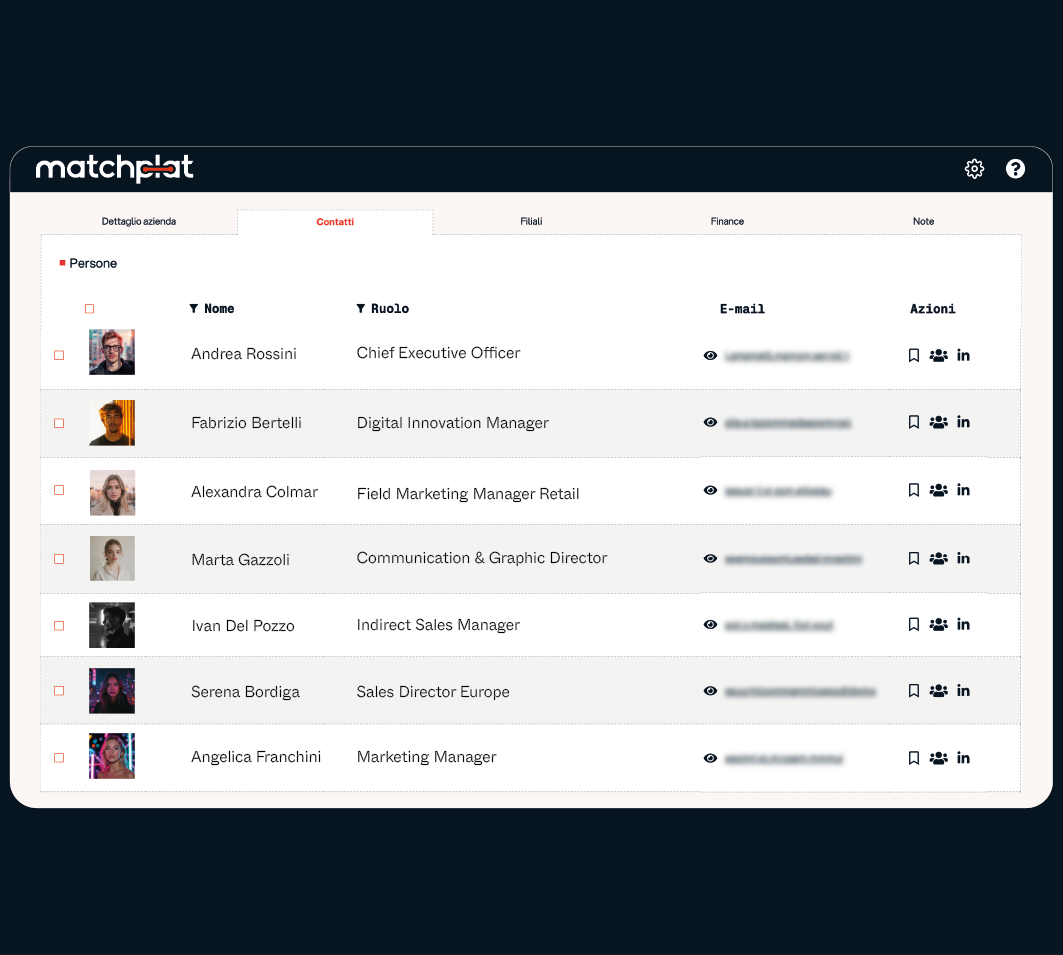 Matchplat raccoglie, verifica e aggiorna ogni giorno milioni di dati su aziende e persone in oltre 196 paesi del mondo. In questo modo otterrai dati affidabili e precisi per rafforzare le tue strategie di business.